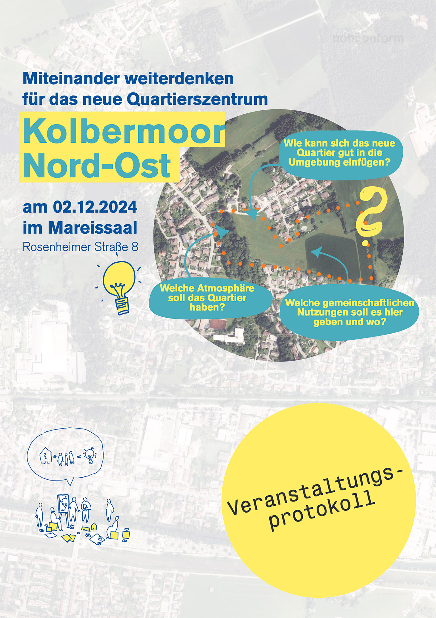 Im Rahmen einer von der Stadt Kolbermoor initiierten Bürgerbeteiligung wurden alle Bürger und Entscheidungsträger dazu eingeladen bei einem offenen Planungscafé sowie einer großen Planungswerkstatt aktiv mitzuwirken. Die nonconform Ideenwerkstätten moderierten den Beteiligungsprozesses und haben alle eingebrachten Ideen, Anregungen, Wünsche und auch Sorgen der Kolbermoorer Bürgerschaft dokumentiert.